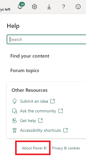 - Have the client send you the URL to their Power BI tenant. This can be found by navigating to Power BI, clicking the “?” in the top right corner, “About Power BI”, and copying the Tenant URL in the pop-up box.